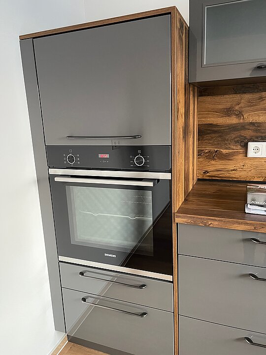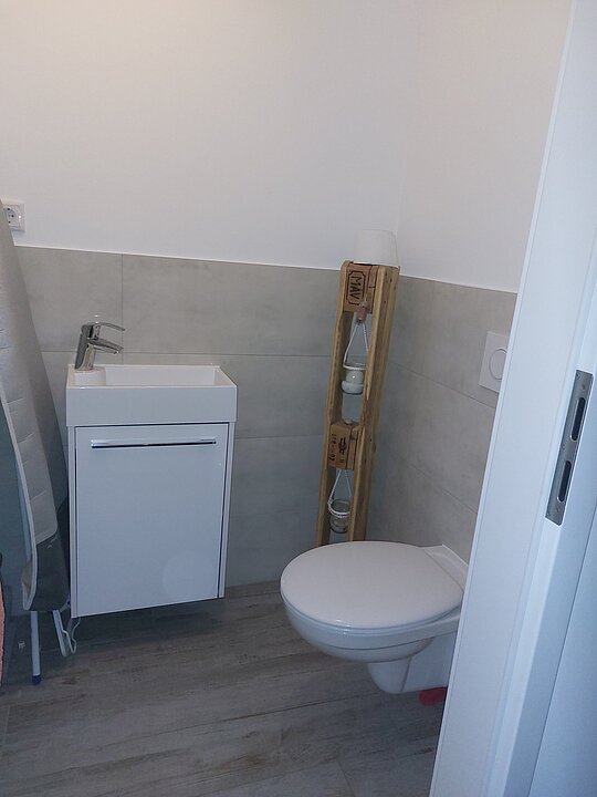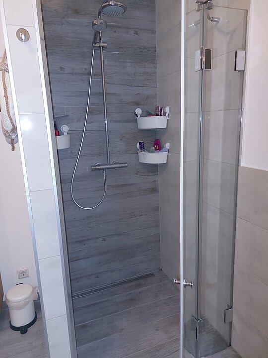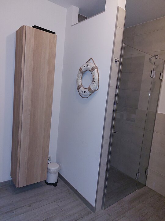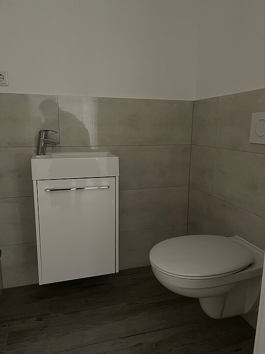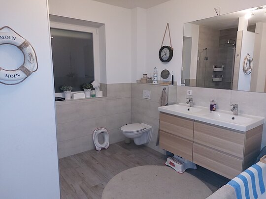 (Fußboden gefliest anthrazit/Holzoptik, Wand in Mamoroptik)