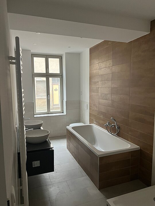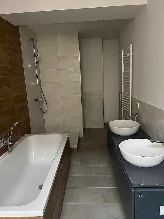 Das Vollbad mit Wanne und Dusche überzeugt durch das moderne Ambiente und bietet neben der Fußbodenheizung über einen Handtuchheizer und einen Waschtisch mit 2 Waschplätzen.